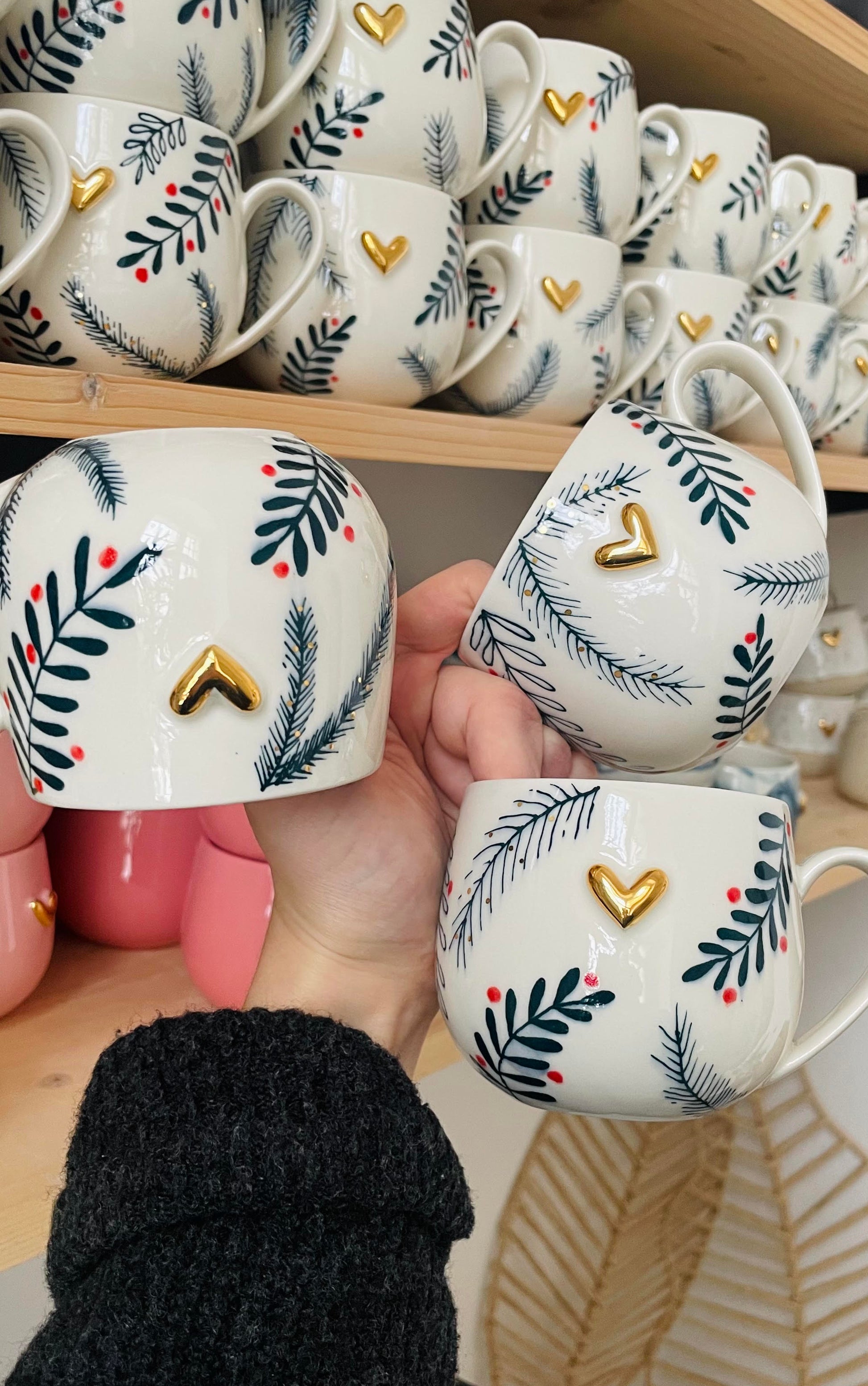 O produktu: Porcelánový hrníček s typickým vystupujícím zlatám srdíčkem a motivem Vánočních větviček dekorovaných zlatem. Větvičky jsou na přední i zadní straně hrníčku. Proces výroby zahrnuje 3 výpaly v keramické peci, v posledním z nich se taví zlato.