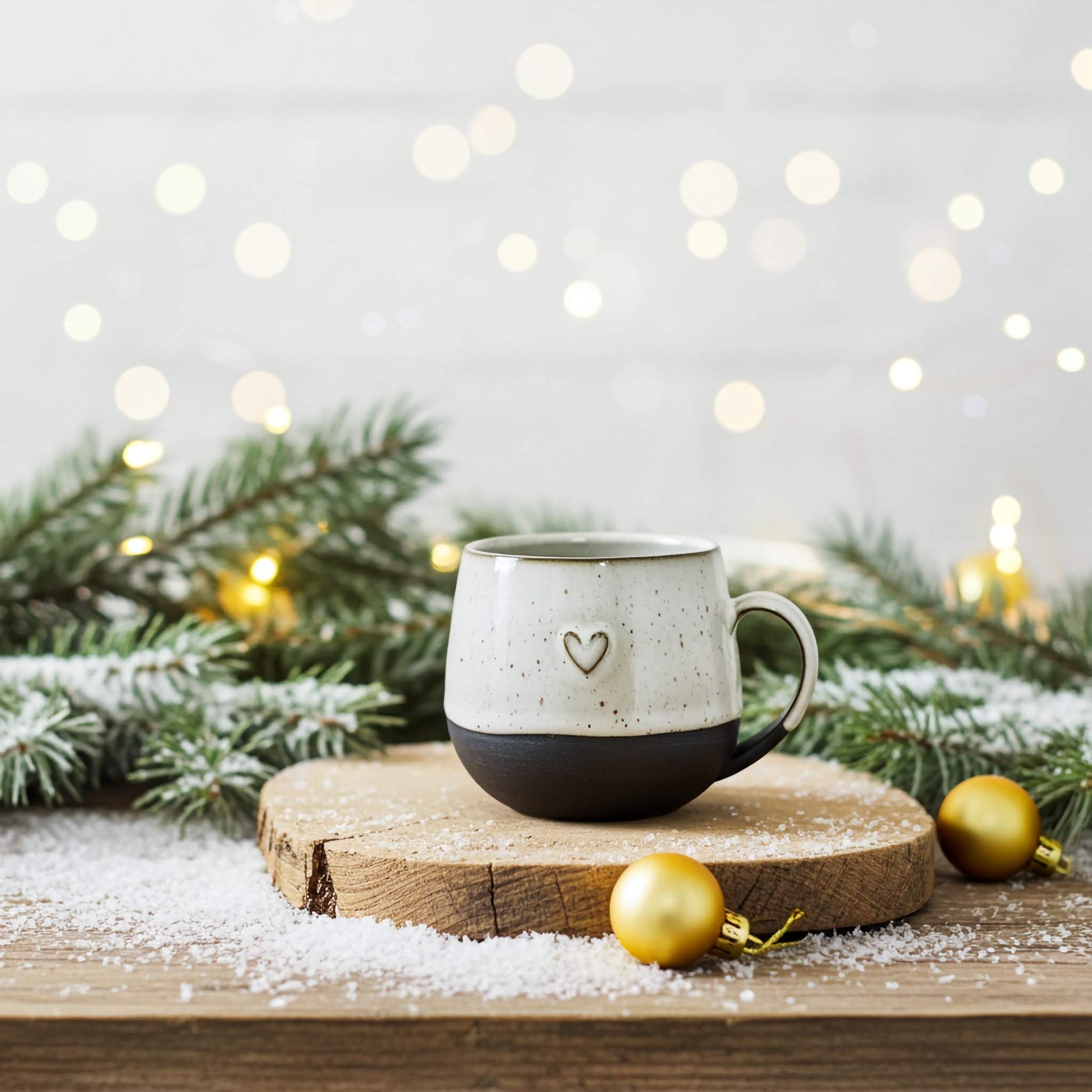 Hrníček je ručně vyroben na hrnčířském kruhu z tmavé, téměř černé kameniny a z části pokrytý světlou glazurou s pigmentem.